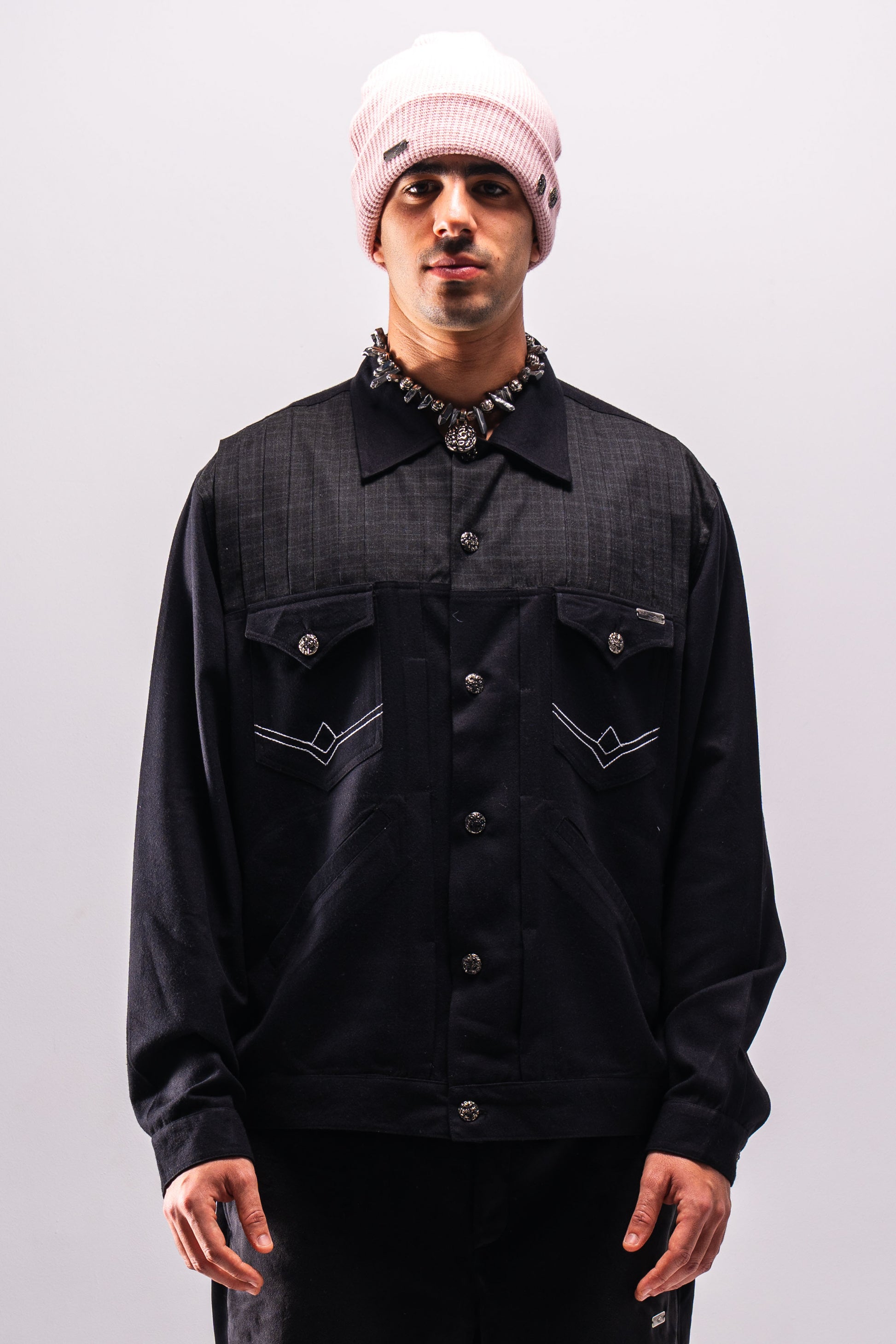 This piece explores a cross-cultural silhouette by merging Renaissance-era pleats, cowboy jacket structure, and Asian-inspired pleating language. The result is a structured yet fluid garment where historical tailoring meets contemporary Cortex design. The pleated wool panels introduce rhythm and depth across the chest, while the overall form stays disciplined and wearable.