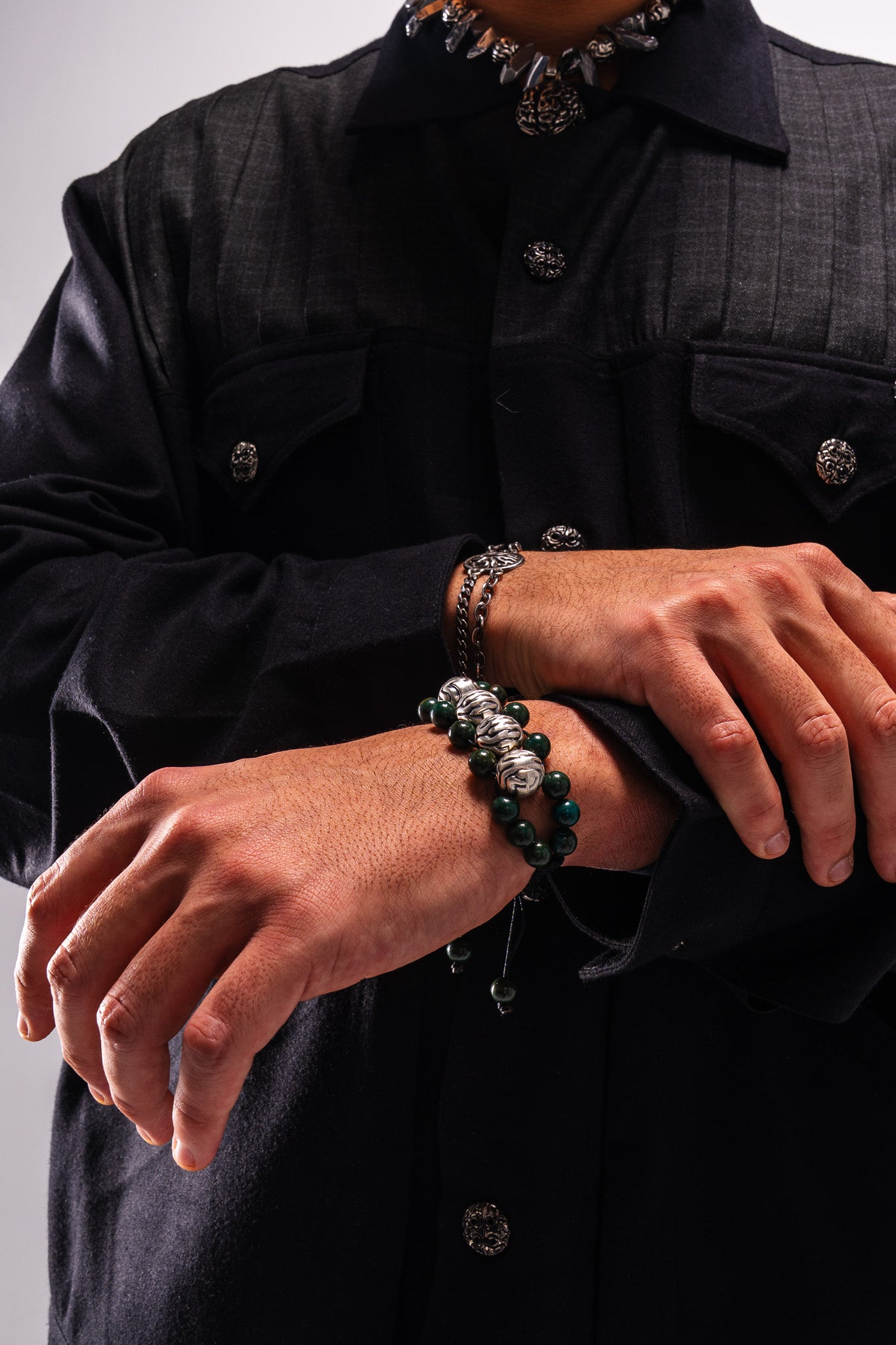 Tailor-made with a relaxed, straight fit. Designed to carry weight and presence without stiffness. Finished with custom brain-shaped buttons, structured pleated panels, and a discreet brass Heiza Studios logo.