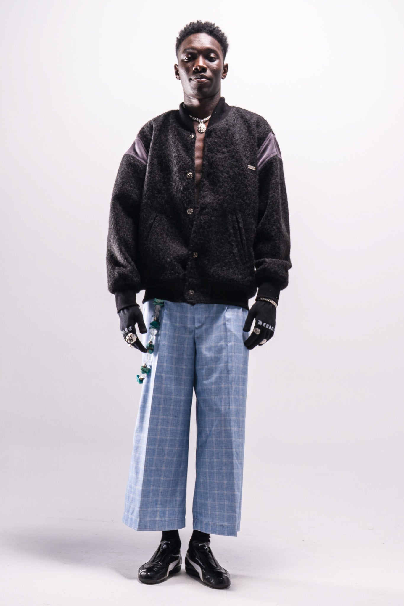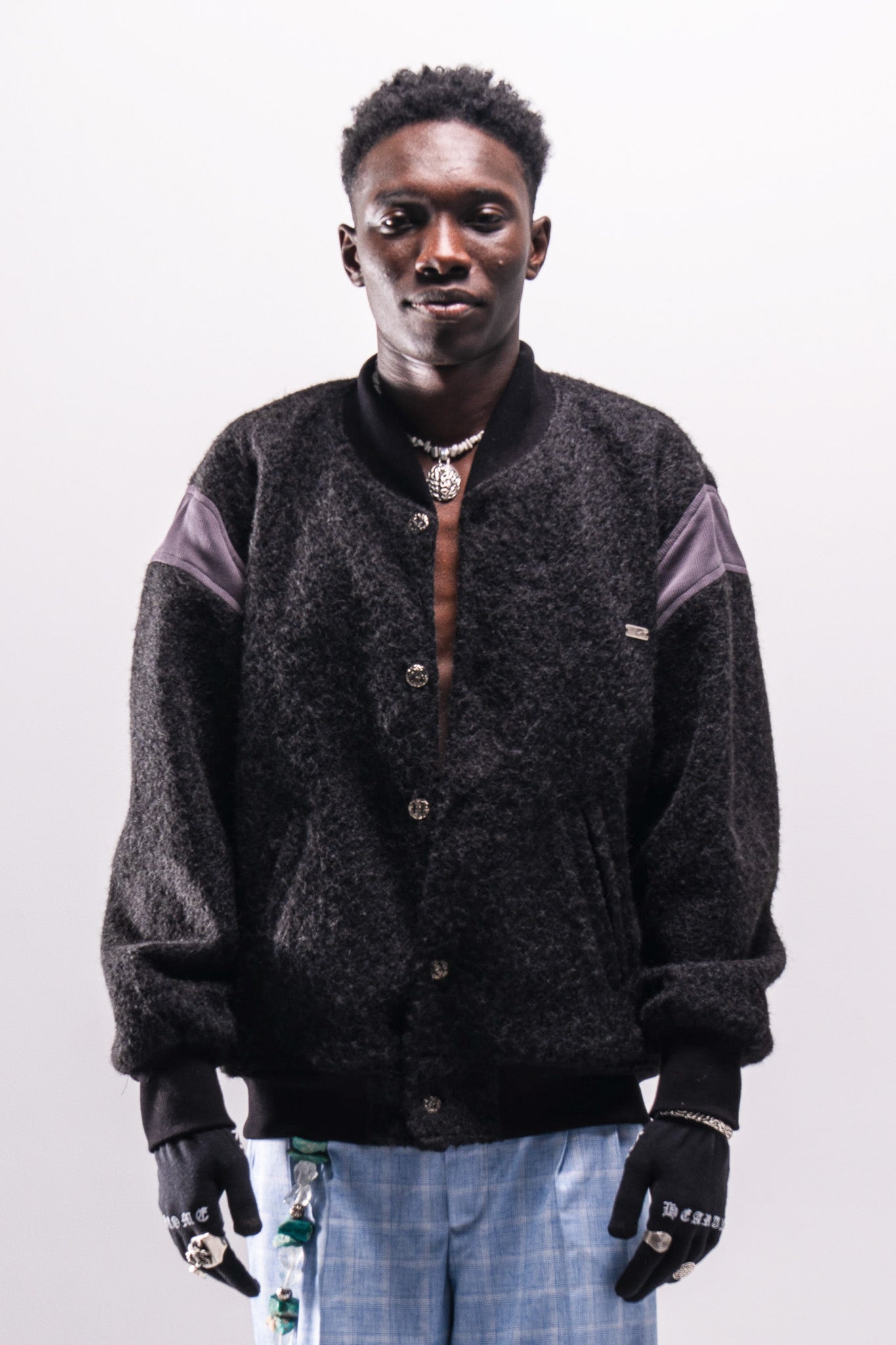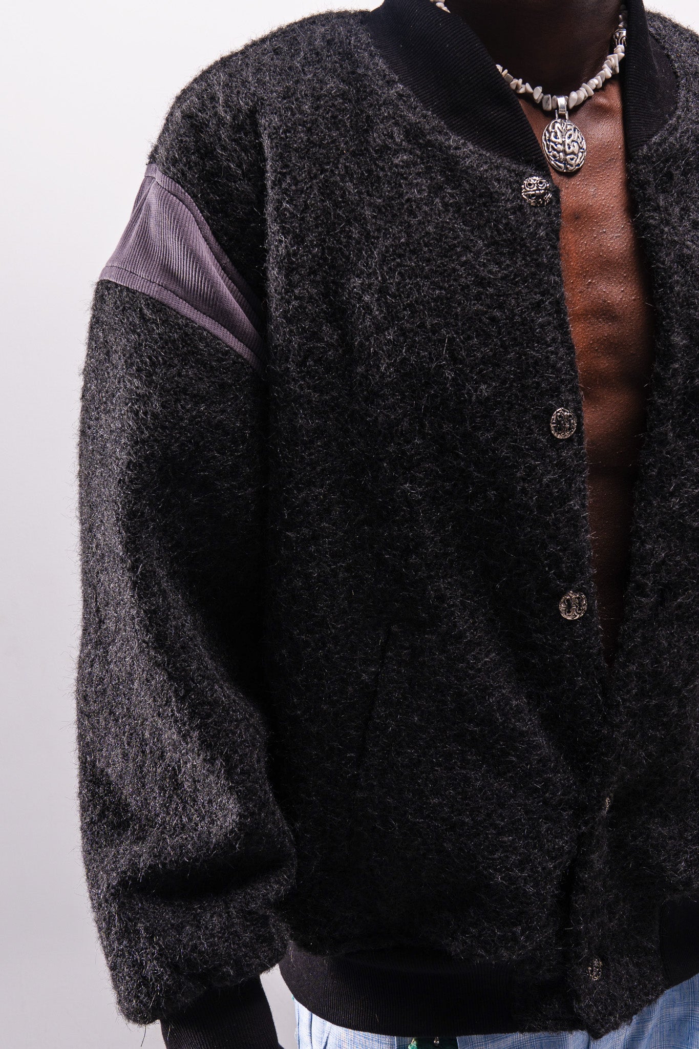 Inspired by classic 90s varsity jackets. The silhouette remains familiar and understated, while Cortex influence appears through a wavy front edge and brain-shaped metal buttons used as closures. The focus is on texture, material, and subtle detailing rather than altering the core form.