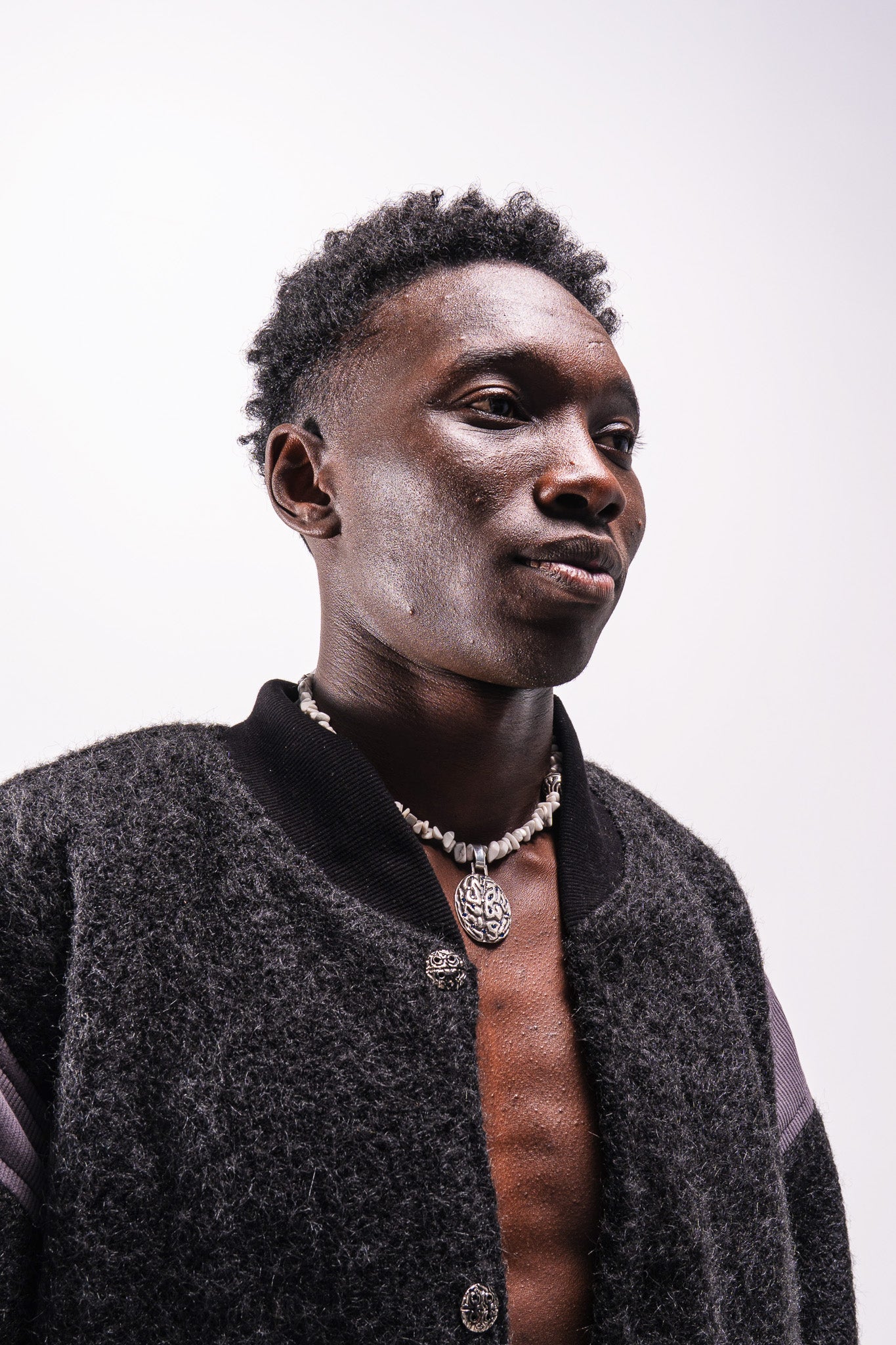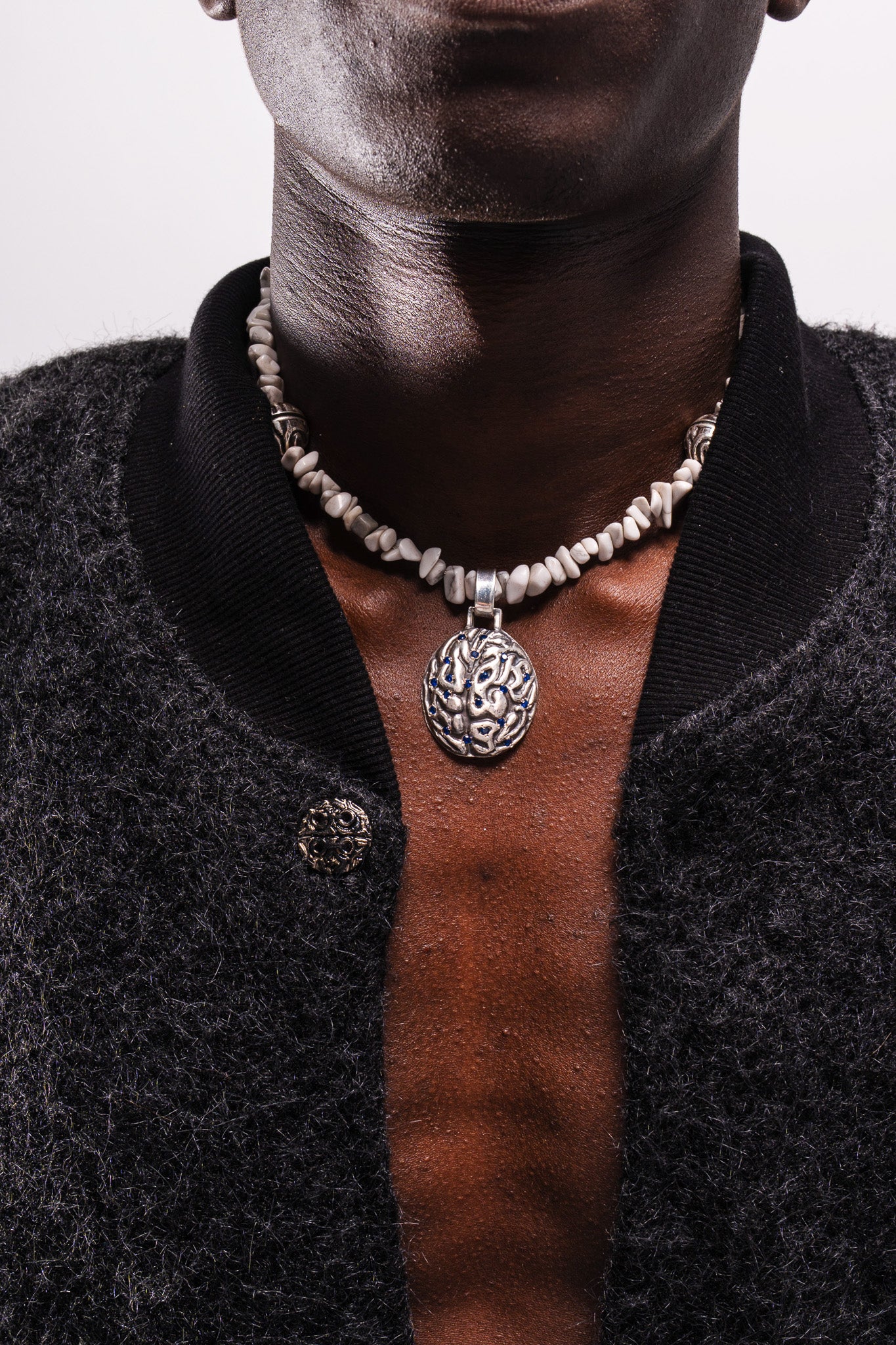 Tailor-made with a relaxed fit. Ribbed cuffs and hem provide controlled structure. Features custom brain-shaped metal buttons placed along the wavy Cortex-inspired closure and a discreet brass logo integrated into the garment.